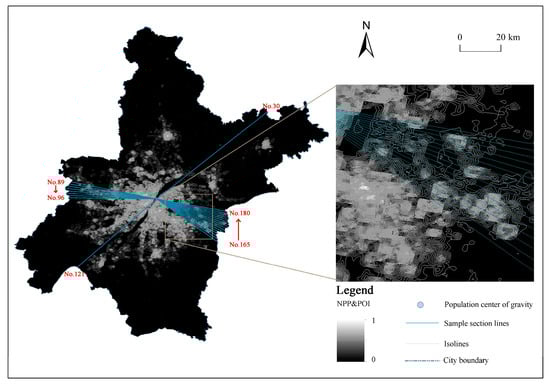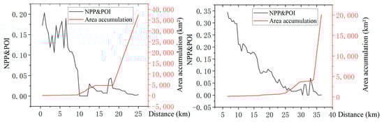 - NPP and POI composite index shows a double mutation law in urban and rural spaces. The first mutation occurred between the urban core area and the URF. With the increasing distance from the urban core area, NPP and POI showed a rapid downward trend. The second mutation occurred between the URF and the rural. With the increasing distance from the URF, the cumulative value of NPP and POI isosurface area showed a sharp upward trend. This law confirms that the urban-rural fringe, as a regional entity generated in the process of urban expansion, objectively exists, has spatial continuity, transition of factors such as economy, population, and land, and consistency of internal characteristics, which is of empirical significance for the discussion of the ternary and binary models in the study of cities spatial structure.