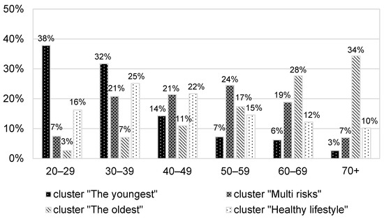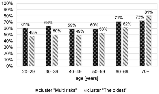 The efficiency of Polish health programmes is additionally affected by the fact that they do not differentiate the scope or methods regarding recipients’ sex or education level and neglect their culture of health (conditioned by age, education, and social status). People from the identified clusters differ in terms of lifestyle and attitude towards their own health—they represent diverse cultures of health. Over one-third of people in the “Multi-risks” cluster did not feel the need to receive medical help or even consultancy in the last year, and almost three-quarters did not undertake any preventive measures. Their physical activity is substantially lower than among “The youngest” (inactive 64% vs. 24%). This difference does not result only from their age. The percentage of inactive members of the “Multi-risk” cluster at 20–40 already exceeds 60% (Figure 1). On the other hand, both “The oldest” and “Healthy lifestyle” clusters comprise mainly females who do care for their health (diet and preventive actions). They clearly differ, however, in terms of age, education level, financial resources (frequency of financial difficulties), and also, possibly, the social support level (frequency of being in a long-term relationship) and opinion on socially accepted women’s behaviours (smoking and alcohol). Different problems in these groups require individualised solutions regarding the provided information and training of particular personal skills. Meanwhile, to increase the persuasive effect of communications in health promotion, effectively broadening recipients’ knowledge and their preparation for making medical decisions, it is recommended to apply culture-sensitive health communication adjusted to beneficiaries’ cultural backgrounds [21].