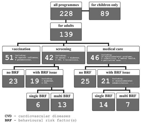 Almost 40% of the total were intended solely for children and adolescents. Adults were most often (in 51 out of 139 programmes) offered vaccination (optional in the country, the most often against influenza—Figure 3). In 80% of cases available to people over 60 years of age. As many as 46 programmes were devoted to the improvement of accessibility of healthcare for people with diagnosed health problems. Forty-two programmes offered participation in the screening examination.