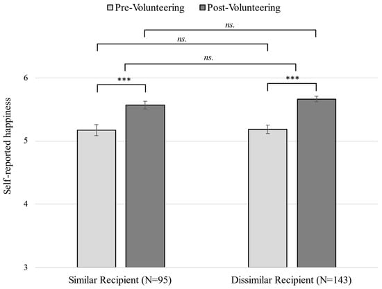 Self-reported happiness before and after packaging items for similar or dissimilar children at the Cradles to Crayons (C2C) Giving Factory. *** p < 0.001; ns = non-significant. Error bars represent standard errors.
