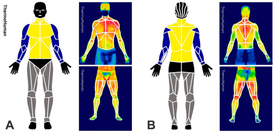ROI analyzed by ThermoHuman® in anterior (A) and posterior (B) views and an example of evaluation by the software. Note: arms, blue; trunk, yellow; legs, gray.