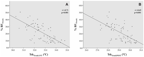 This pattern of negative variation observed between the Tsk values of obese and non-obese adolescents was also verified in the correlation between the variables. We found a negative relationship between %BFglobal and Tskglobal (r = −0.57, p < 0.001), between the %BFTrunk and TskTrunkANT (r = −0.71, p < 0.001) and TskTrunkPOST (r = −0.65, p < 0.001), %BFArms and TskArmsANT (r = −0.29, p < 0.01) and TskArmsPOST (r = −0.36, p < 0.001), and %BFLegs and TskLegsANT (r = −0.45, p < 0.001) and TskLegsPOST (r = −0.44, p < 0.001), with emphasis on the values observed in the trunk region, as illustrated in Figure 2.