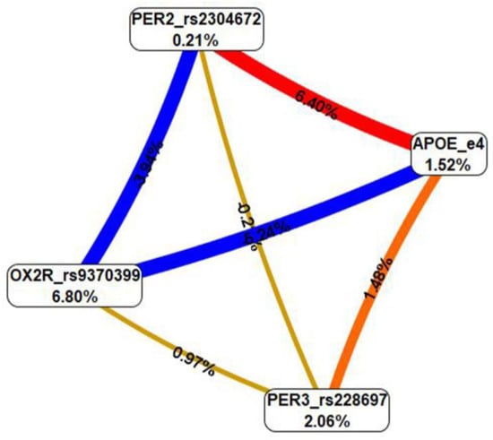 Interaction entropy graph for gene–gene interactions via multifactor dimensionality reduction (MDR) analysis. Information gain summary by main effects can be found inside the boxes. The effects by pairs indicate interaction in red or orange lines, which can be interpreted as a synergistic or non-additive relationship; meanwhile, negative entropy (yellow-green or green lines) indicates independence or additivity (redundancy). The best model in gene–gene interaction was PER2_rs2304672 and PER3_rs228697 with APOE_ε4. This result suggested that the interaction between the PER2-PER3 and APOE_ε4 genes may play an important role in the pathogenesis of BPSD in our sample of AD patients.