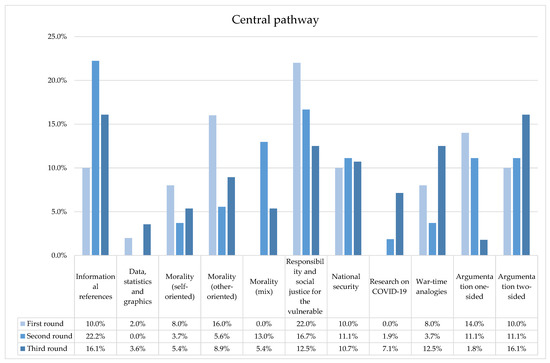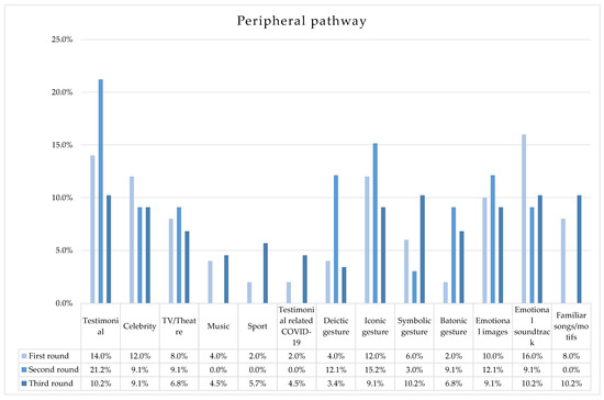 Percentage distribution of spots for each peripheral cue across the three rounds of the Italian institutional health campaign during COVID-19 pandemic.