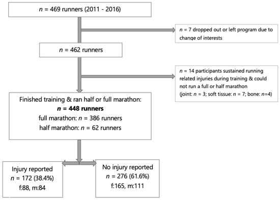 Over the 5-year period of this study, 469 high school students participated in the DREAMFAR program. Seven participants chose to leave the program due to a change in interest. Fourteen participants dropped out of the program due to injury (3% of all participants). In total, 448 participants (253 girls and 195 boys) completed the full training season, which culminated with participation in a half or full marathon (Figure 1).