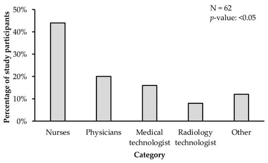 Among the healthcare workers that had a prolonged exposure to suspected or confirmed COVID-19 patients (N = 25), nurses (44%, N = 11) were the ones at higher risk (p-value < 0.05) compared to physicians (16%, N = 4), medical technologists (16%, N = 4), and radiology technologists (8%, N = 2) (Figure 1).