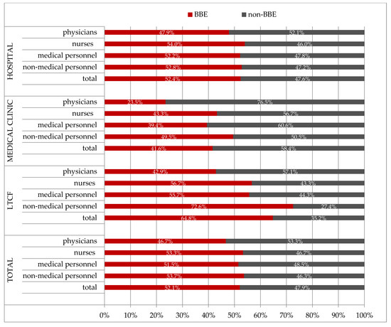 Moreover, we did not observe significant differences in the compliance with the BBE concept between medical and non-medical personnel employed in the hospital (2523/4831; 52.2% vs. 1091/2065; 52.8%, respectively, p = 0.6435) and clinic (135/343; 39.4% vs. 47/95; 49.5%, respectively, p = 0.0767). In LTCFs, non-medical personnel (82/113; 72.6%) were more often present in the BBE group compared to medical personnel (54/97; 55.7%) (p = 0.0106). We noted that only every fourth physician (16/68; 23.5%) employed in the clinic complied with the BBE concept (Figure 1).