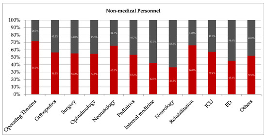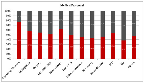 We noted that only 23.2% of medical personnel employed in the operating theatre were in the non-BBE group, and this observation presented a significantly lower frequency value compared to physicians and nurses employed in other departments (p < 0.05) (Figure 2). In internal medicine, neurology, and rehabilitation departments, the majority of medical personnel were significantly more often present in the non-BBE than in the BBE group (54.0% vs. 46.0%; p = 0.0001, 56.0% vs. 44.0%; p = 0.0291 and 53.7% vs. 46.3%; p = 0.1646, respectively).