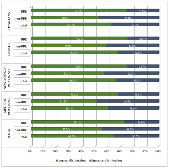 In the group of 3932 people who adhered to the BBE concept, 2875 (73.1%) correctly disinfected their hands, compared to 55.5% (2004/3612) from the non-BBE group, and it was a statistically significant difference (p < 0.0001). This correlation applied to all professional groups (Table 5 and Figure 4).