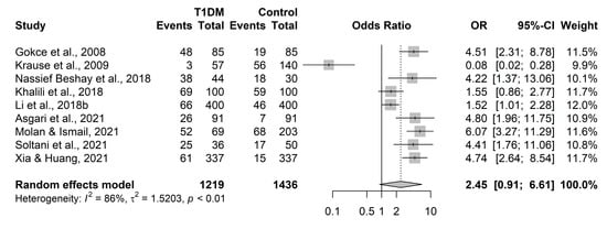 Figure 2. Meta-analysis results of the association between Toxoplasma gondii infection and type-1 diabetes (T1DM) using all nine identified studies [8,9,14,22,23,24,25,26,27]. OR, odds ratio; CI, confidence interval.