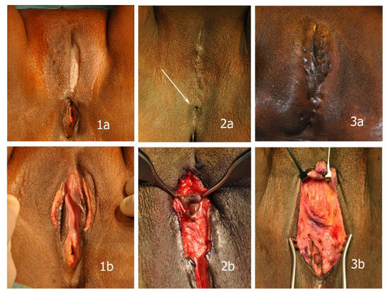 In spite of considerable differences in the extent of the mutilations, all cases shown are classified as Type IIIb mutilations according to the present WHO classification. (1a,1b) partial deinfibulation before sexual intercourse with almost unharmed minor labia and clitoris underneath the scar; (2a,2b) minimal opening left after infibulation (arrow) and unharmed clitoris in a small cyst encapsulated in scar tissue with resected minor labia; (3a,3b) extensive fistulae after suturing that required excision prior to reconstruction; resected clitoral glans and labia.