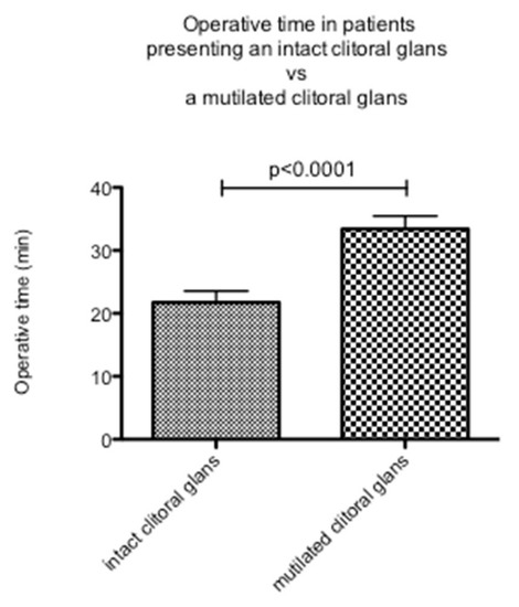 Operative time in patients with an intact clitoral glans compared to patients with a completely or partly resected clitoral glans.
