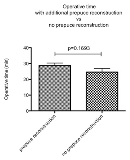 Operative time in patients with additional prepuce reconstruction compared to patients in whom no prepuce was reconstructed.