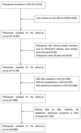 At baseline in 2013, the total sample consisted of 18,612 participants. We excluded 4349 individuals who were lost to follow-up from 2013 to 2018. Meanwhile, 28 participants were excluded due to memory-related disorders, such as Alzheimer’s disease, brain atrophy, and Parkinson’s disease, while 36 participants under 40 years old were also excluded. We further excluded those who had already developed IADL disability (n = 3758), life dissatisfaction (n = 507), or depressive symptoms (n = 2046) at baseline in 2013. Then, 1422 participants without complete information on the core variables, such as IADL disability and life satisfaction or other covariates, were also excluded. The final number of participants aged 40 years and above who were available for the follow-up survey was 6466. The details are shown in Figure 1.