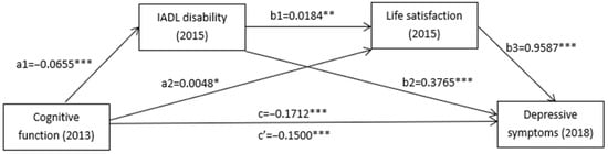 Serial mediation models for cognitive function, IADL disability, life satisfaction, and depressive symptoms. Note: Path coefficients were shown in the standardized regression coefficient. * p < 0.05, ** p < 0.01, *** p < 0.001.