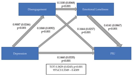Mediation analyses showed that depressive symptomatology (as measured by DASS-21 depression subscale) predicted PIU (as measured by IAT) and that their interaction is double mediated by MSBS and ILS total scores (Figure 1), and, particularly, is also double mediated by MSBS disengagement subscale and ILS emotional loneliness subscales (Figure 2) as well as by MSBS inattention subscale and ILS emotional loneliness subscales (Figure 3) (ß = 0.3829 (0.0245), 95%CI = 0.3349–0.4309).