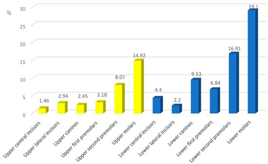 Debonding of brackets in this study was more commonly found in the mandibular dental arch (p < 0.01). Such results correspond to the previous studies carried out by other researchers [,,,,]. These higher failure rates were attributed to occlusal interferences because brackets on lower teeth can be affected by upper teeth cups during mastication, especially in case of increased overbite. Nevertheless, Naqvi et al.’s study provided the opposite results []. Present findings are consistent with previous studies, which showed that bond failure is more common in posterior teeth [,,]. It is probable that posterior teeth are more difficult to isolate from moisture during the bonding of brackets. Moreover, posterior teeth are affected by heavier occlusal forces than anterior teeth during mastication []. It is worth mentioning that the bonding strength could be affected by greater aprismatic enamel and poorer etch quality for the posterior teeth than the anterior teeth []. Besides, first molars have big restorations and attrition more often, which worsen the anatomy of the tooth and lead to inadequate adaptation of the bracket to the tooth surface.