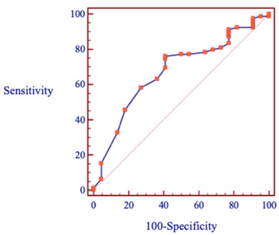 The receiver operating characteristic (ROC) curve to evaluate trade-off between sensitivity and specificity. The area under the curve—67.5%, sensitivity—75.9%, and specificity—59.1%.
