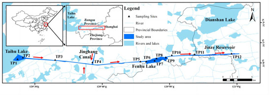 Sampling strategy was made according to river topography, with high sampling frequency at areas with complicated hydrodynamic conditions including inflow, outflow, intersection, and significant increase in width [31,32] (Hånkanson and Jansson, 1983; GB17378.3-2007). Therefore, a total of 12 sampling sites of TP1–TP12 were laid along the Taipu River from East Taihu Lake (upstream) to Jinze Reservoir (downstream), including the upper, middle and lower reaches of the river. As it has been shown in Figure 1, core samples were collected every 7.5 km along the river. Sampling frequency was higher in east Taihu Lake where water flows into the river and in the Fenhu Lake (TP6–TP10). Sampling sites of TP4 and TP11 were allocated at the intersection with main tributaries.