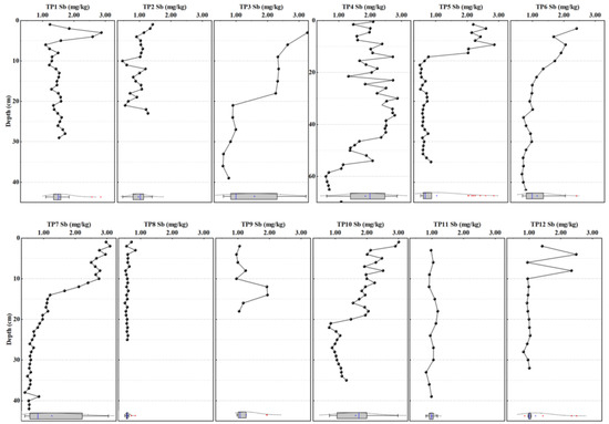 The vertical distribution of Sb in sediment cores sampled in the Taipu River (concentration of Sb (mg/kg): TP1: 1.10—2.87, TP2: 0.46—1.42, TP3: 0.59—3.27, TP4: 0.59—2.88, TP5: 0.50—2.86, TP6: 0.67—2.41, TP7: 0.41—3.10, TP8: 0.51—0.84, TP9: 0.95—1.94, TP10: 0.81—3.01, TP11: 0.82—1.18, TP12: 0.83—2.49).