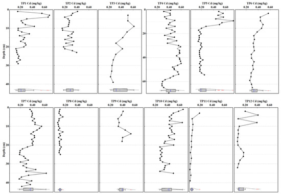 The vertical distribution of Cd in sediment cores sampled in the Taipu River (concentration of Cd (mg/kg): TP1: 0.13–0.68, TP2: 0.16–0.41, TP3: 0.22–0.61, TP4: 0.28–0.60, TP5: 0.15–0.73, TP6: 0.26–0.57, TP7: 0.18–0.62, TP8: 0.07–0.16, TP9: 0.32–0.54, TP10: 0.28–0.66, TP11: 0.03–0.19, TP12: 0.07–0.41).