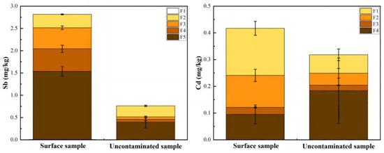 Figure 4 demonstrates the fractionation of Sb and Cd in the sediment core collected at TP7. In general, difference lies not only between surface (0–10 cm) and deep sediments, but also between Cd and Sb because of their geochemical behavior. For Sb, the residual fraction accounted for 54% and 52% of the total in surface and deep sediments, respectively, while the proportion of residual Cd was 23% and 57%. The residual fraction was mainly associated with non-soluble minerals, such as silicate [45]. This fraction is least affected by the environment and is believed to be dominated by natural contribution [46]. Nevertheless, the deep sediments also contain Sb and Cd in other fractions which are more reactive. According to the vertical distribution of Sb in TP7 (Figure 2), deep sediment can be generally regarded as uncontaminated. However, there was also a considerable amount of Sb presented in the specifically-sorbed phase. Dissolution of natural Sb in sediment under reducing conditions may take place [47]. The dissolved Sb can be effectively adsorbed by Fe/Mn (hydr)oxide [48]. Moreover, Oht et al. (2010) [47] also reported natural Sb precipitated with Mn oxides under oxic conditions. This explains the existence but a small proportion of Sb in the crystalline and amorphous oxides fraction in uncontaminated sediments. For Cd, the acid extractable fraction accounted for 16% of the total in deep sediment. This fraction is associated with water-soluble, cation-exchangeable and carbonates [40]. Taihu Lake, which is underlain by limestone, is the main source of the Taipu river water. This leads to Cd primarily presenting in carbonate fraction in sediments [49]. Reducible and oxidizable fraction of Cd were about 29% and 6% of the total. Nevertheless, the non-residual fraction of Cd and Sb is much more abundant in surface sediments than that in deep sediments which proofs that anthropogenic PTEs are usually more reactive.
