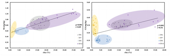 In order to reduce the influence of other factors, results of sediment cores collected from the Fenhu Lake was studied (TP6, TP7, TP8, and TP10) to discuss the impact of sedimentary environment to natural Sb and Cd distribution in deep sediments which were uncontaminated or much less contaminated. As it has been discussed above, samples at TP9 were eliminated. Particle size distribution is related to its sedimentary environment. There was a wide range of clay contents in sediment samples down through the core at TP10 (9.7–36.5%), which was located on the river channel. The texture of sediments in TP10 was more scattered in the Shepard triangle diagram (Figure S2). They were mainly clay silt, sandy silt and silty sand. As a channel for flood discharge, the shear velocity of Taipu river water can be high enough to entrain the coarse grain at the flooding period [50]. In contrast, there was less proportion of fine particles in dry season. At other locations, there was a much smaller variation in particle size. The range of clay content in sediment collected from the inlet (TP6) of the lake was 11.2–21.6%. Sediments from this site were silt and clay silt. They were poorly sorted and were likely to be the suspended load [51]. Very low clay contents were found in sediments from the middle of the Fenhu Lake (TP7: 0.63–2.60% and TP8: 2.44–9.77%). There were more coarse particles deposited at these two sites because of the relatively low shear velocity [50]. And there were layers with considerable amount of sand deposited when the flow rate was low.