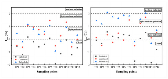 where Ci represents the total concentration of Sb and Cd in surface sediments (mg/kg); BV represents the geochemical background value of Sb and Cd (mg/kg). Three kinds of BV were selected in this study, which included the BV obtained by statistical methods, combined methods, which calculated in Section 3.3, and the BV of soil from Taihu Basin quoted from Liao et al. (2011) [61]. When Igeo was calculated using the BV from the combined method, the value corresponding to each sampling point was selected. The factor of 1.5 was introduced to normalize lithogenic effects [3].
