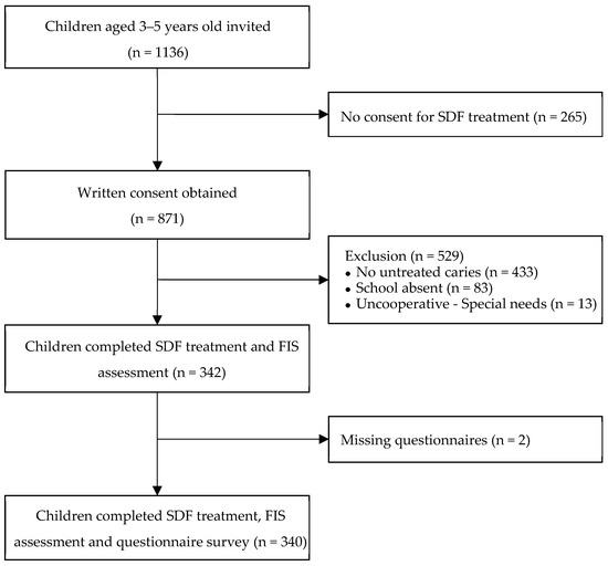 - Duangthip, D.; Gao, S.S.; Chen, K.J.; Lo, E.C.M.; Chu, C.H. Oral health-related quality of life and caries experience of Hong Kong preschool children. Int. Dent. J. 2020, 70, 100–107. [Google Scholar] [CrossRef]