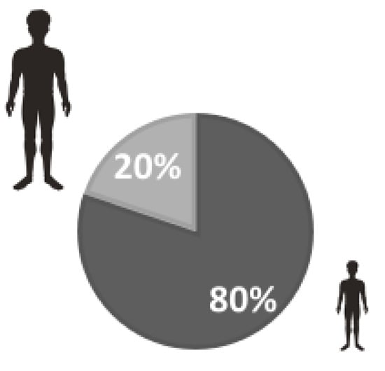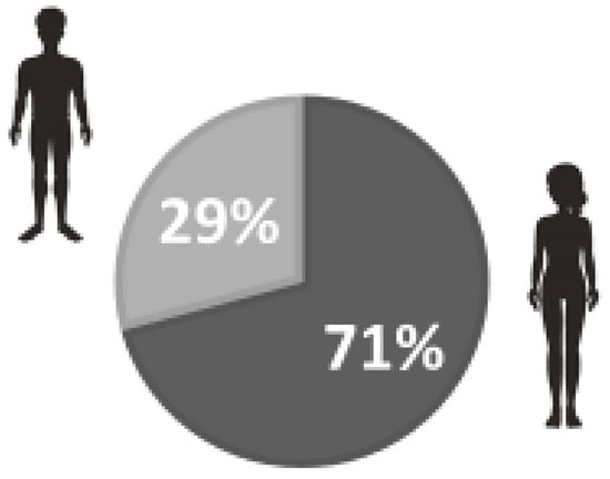 The study sample consisted of 877 people whose mean age was 27.25 years (±13.79). By age group, the sample included 703 people under 39 years of age (80.5%), 142 between 40 and 59 years (16.3%) and 32 over 60 years (3.2%). Of the total, 617 were women (70.4%) (Figure 1), 556 lived in a flat larger than 50 m (63.4%), and 594 (67.7%) lived in a rural environment. The mean number of cohabitants was 3.49 (±1.02). 98.6% were of Spanish nationality. The most frequent level of education was university studies (57.4%), followed by intermediate studies (36.7%). The distribution of the sample characteristics in terms of screening tests, diagnosis and quarantine status related to COVID-19 by age is summarized in Table 1, according to two age groups (Group 1: under 39 years; Group 2: over 40 years). Figure 1 represents the distribution of the sample by gender, the sample being mostly female. Figure 2 shows the sample based on age, where those under 39 are the most numerous.