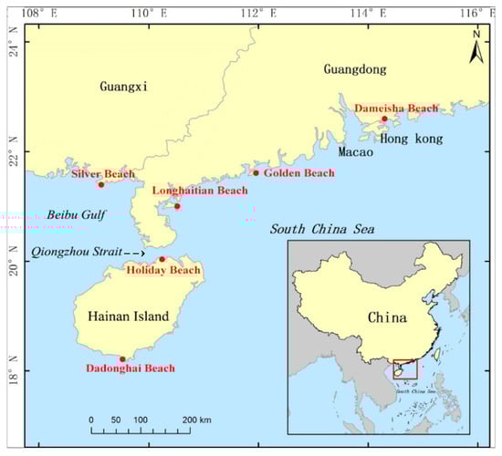 Location of the six beaches on the map of China. They are all famous tourist attractions in South China, namely, Silver Beach in Beihai City, Longhaitian Beach in Zhanjiang City, Hailing Island Gold Beach in Yangjiang City, Dameisha Beach in Shenzhen City, Holiday Beach in Haikou City, and Dadonghai Beach in Sanya City.