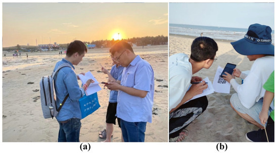 According to the results of the online questionnaire, the respondents who had not heard of rips and had not seen their warning signs accounted for a large proportion since they had not received relevant education or training. Therefore, the educational strategy was implemented for beachgoers in the field questionnaire survey. The survey process is described as follows. (1) Beachgoers’ demographics, swimming ability, information of visiting beaches, and awareness of rips were investigated following the questions listed in Appendix A. (2) The basic knowledge of rips was introduced to the respondents, and the video with rips was shown to them. A video was translated well in advance and annotated with Chinese subtitles. (3) Some examples were offered to illustrate the existence of rip current hazards on some beaches in China, and show that many drowning accidents have been caused. (4) The escape methods from rips were publicized: keep calm and swim parallel to the direction of the coastline, or drift with the current to a distance, then swim parallel to the direction of the coastline for a distance after the flow rate decreases, and finally swim back to the shore. (5) Respondents were invited to answer questions 13 and 14 again. Figure 3 exhibits the intervention work for beachgoers on the beach site.