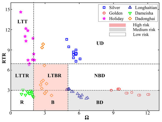 The calculated dimensionless sediment fall velocity Ω and tide-wave parameter RTR divide the beach state into 8 types corresponding to different levels of rip current hazard [34,35], which are defined as Equations (1)–(4).