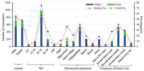 Demographic characteristics of online and field respondents, including gender, age, educational attainment and frequency of beach visit. The bar chart indicates the number of respondents, and the line chart indicates the percentage of each indicator.