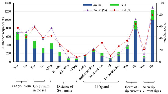 Respondents’ swimming ability and awareness of rips, and the distribution of beach lifeguards from the respondents’ responses. The bar chart indicates the number of respondents, and the line chart indicates the percentage of each indicator.