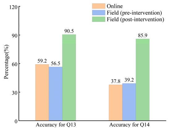 Comparison of the overall accuracy of online and field respondents in identifying rip current and choosing escape direction, as well as the accuracy after implementing educational strategy.