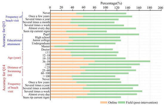In our study, the results of the two survey methods were compared to verify the implementation effect of the educational strategy. On the whole, there was very little difference between online and field respondents in the accuracy of identifying rips and choosing the correct escape route. However, the accuracy of the educated respondents in identifying the location of rip current increased from 56.5% to 90.5%, and the accuracy in choosing the escape direction increased from 39.2% to 85.9% (see Figure 8). Concerning demographic characteristics, respondents with higher education had higher accuracy in selecting the location of rip current, but this trend was not obvious when choosing the escape route. The results of the online survey also reflected this trend in general. Regarding swimming ability, beach visit frequency, and awareness of rips, the accuracy in choosing escape direction was also significantly improved (see Figure 9). This implied that our survey results had universal significance, and the educational strategy implemented was effective.