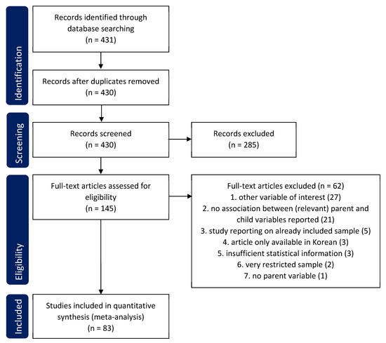 The literature search yielded overall 431 records. After the removal of duplicates, 430 abstracts were screened, and 285 records were excluded. The full texts of the remaining 145 articles were screened for eligibility. Finally, a total of 83 articles were allocated to the four research questions and included in the analyses. See Figure 1 for the PRISMA flow chart [40].