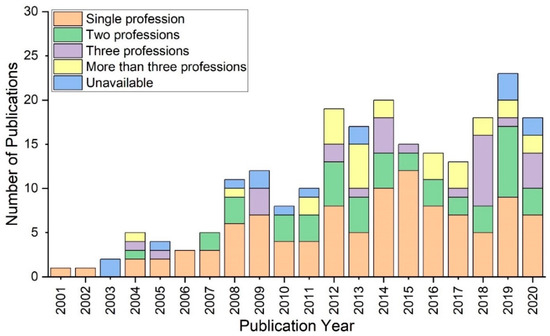 The bar chart indicates that simulation studies involving only one profession were distributed across the time period (Figure 2). While some researchers attested to the competency of two professions, others researched three or more. Overall, research involving only one profession had the largest number of publications, whereas there were few studies that did not explicitly state any profession. Those involving two professions and more than two professions had 59 and 76 publications, respectively. Notably, these categories have similar profiles. The frequency of publications involving only one profession grew substantially between 2001 and 2009. It fell somewhat between 2009 and 2010. Following that, the number of publications increased until it peaked at 12 in 2015. Its proportion, however, fell dramatically during the next five years.