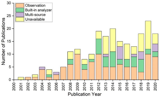 Observations were the most common source of behavioural data during the time period, as shown in Figure 3. Between 2001 and 2010, the majority of research recognised video and verbal references among participants. In addition, built-in analysers have become more popular in screen-based and human–patient simulations. This was a promising source of behavioural data, whether quantitative or qualitative, as it provided a better understanding of the levels at which participants engaged the most. Simulation studies combining observational data and analysis procedures have contributed to a large proportion of publications between 2015 and 2020. However, in the last five years, studies that did not rely on any specific data sources have become more common. There is a need to take advantage of actionable intelligence in order to describe the psychological profiles of participants.
