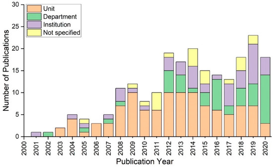 As seen in Figure 4, the literature study identifies the operational clinical environment at the unit, department, and institution levels. The majority of research in this sector has been unit-wide, carefully monitoring the health status of patients. The data reveals that 2009 was the year with the highest number of unit-wide simulation studies, followed by a gradual increase in the number of publications addressing non-technical skill issues at the institutional level. Prior to 2011, there was department-wide training, with a steady growth in publications from 2017 to 2020. It is important to note that a number of studies have not explicitly stated the level of the operational clinical environment.