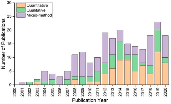 Figure 5 presents the number of papers employing quantitative, qualitative, or mixed-method approaches. More than half mixed-method studies were conducted before 2010. From 2011 through 2014, there was a small decline; however, in 2015, the number of articles using quantitative approaches grew to 9. After reaching its maximum, the number of publications declined to 8 by 2020. In 2007, only a couple of studies used qualitative methods. The number climbed to 7 in 2014 and then decreased dramatically in 2017. In the last three years, the number has varied from 8 in 2019 to 2 in 2020.