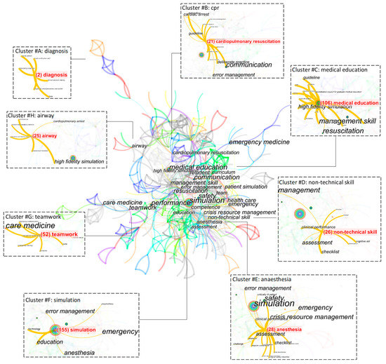As shown in Figure 6, the citation networks of articles are formed by keywords such as simulation (155), medical education (106), teamwork (52), anaesthesia (28), non-technical skill (26), airway (25), cardiopulmonary resuscitation (21), and diagnosis (2). Remarkably, each network contains publications throughout the course of the time period. Simulation, the keyword from the core thematic trend, leads to technology, education, anaesthesia, error management, emergency, and preparedness—this is an example of how the central citation network has extended to spearheading research areas. Through research efforts on educational technology, communication, and cultural value, articles on teamwork have covered both the technological and social aspects. Up to this point, these networks have had a lower concentration. In contrast, medical education develops a more complex cluster despite being referenced less often. The second-largest cluster publishes articles in certain areas, such as high-fidelity simulation, management skills, guidelines, and resuscitation. This pattern also applies to other clusters with smaller numbers of publications. Anaesthesia is an important subcategory of study that led to the research fields of crisis resource management and safety. Similarly, non-technical skills, connected by clinical performance, assessment, and checklists, proceed to cognitive aid. Airways and diagnosis have created new research revenues in clusters away from their central counterparts, indicating a broader scale of medical simulations.