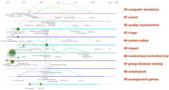 Figure 8 presents the timeline view of the CiteSpace map. The solid lines denote thematic horizons such as computer simulation, outcome, quality improvement, triage, patient safety, impact, randomised controlled trials, group decision-making, anaphylaxis, and management games, covering methodological and application-oriented perspectives. In addition, a group of phrases are identified as keywords to illustrate how they have changed over time. It is worthwhile to note that triage, impact, and randomised controlled trials exist throughout the time period. Prior to 2010, a preponderance of new ideas and approaches was created, as seen by the graph. The treatment of critically ill patients with anaphylaxis was inspired by the intersection of computer simulation and resuscitation. Simulation in the management game’s thematic horizon continues with medical care and teamwork. Last but not least, later in the timeline, there are keywords such as “cognitive aids,” “tools,” “patients,” and “programmes” on patient safety, triage, and computer simulation.