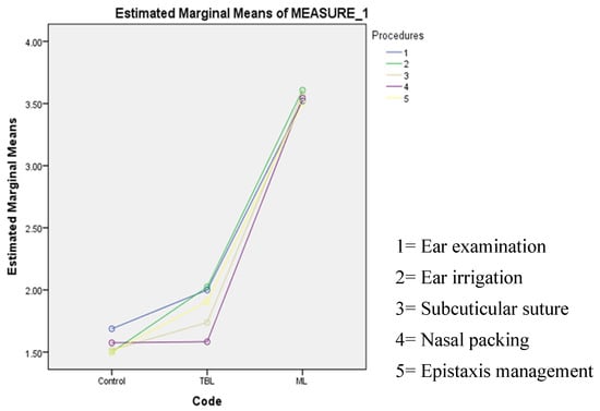 We conducted the Repeated Measurement ANOVA test to assess the differences of mean DOPS scores for each task in the study groups and observed no significant differences (Table 4 and Figure 1). This finding indicates that the task type had no effect on the results.