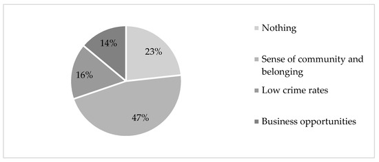 Figure 1 summarises the key themes identified from the responses to the first question. The category titled “nothing” indicates that community members felt that there was nothing to like about their respective towns. A total of 23% of community members felt a sense of community and belonging towards their town, whereas 16% and 14%, respectively, appreciated the low crime rate. The business opportunities in RLM were appreciated by 14% of community members.