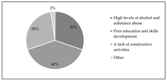 According to Figure 2, 30% of respondents did not appreciate the high levels of alcohol and substance abuse, 40% did not appreciate the poor education and skill levels in RLM, and 28% did not appreciate the lack of constructive and recreational activities.