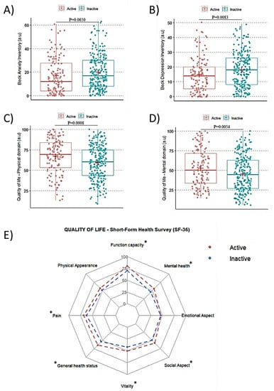 Santana, E.E.S.d.; Neves, L.M.; Souza, K.C.d.; Mendes, T.B.; Rossi, F.E.; Silva, A.A.d.; Oliveira, R.d.; Perilhão, M.S.; Roschel, H.; Gil, S. Physically Inactive Undergraduate Students Exhibit More Symptoms of Anxiety, Depression, and Poor Quality of Life than Physically Active Students. Int. J. Environ. Res. Public Health 2023, 20, 4494. https://doi.org/10.3390/ijerph20054494