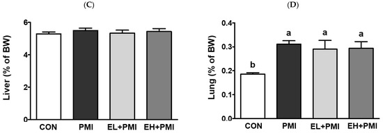 Pulmonary PM exposure (PMI, EL + PMI, and EH + PMI) did not significantly alter the final body weight at sacrifice (Figure 1A). In contrast, delta body weight and relative lung weight were significantly increased by PM instillation (Figure 1B,D). Interestingly, EA treatment significantly attenuated the delta body weight against PM exposure regardless of the EA concentration (Figure 1B). However, PM-induced lung weight did not change with EA treatment (Figure 1D). There were no significant differences in the relative liver weight among the experimental groups (Figure 1C). EA treatment did not affect the final body weight or the relative lung and liver weights. The overall changes in patterns of delta body weight and relative lung weight exhibited similar trends to our previous studies on quercetin treatment [21]. In our previous findings, PM instillation increased delta body weight [20,21]; however, quercetin treatment inhibited the PM-induced increase in delta body weight [21], similar to the effect exerted by EA treatment in the current study.