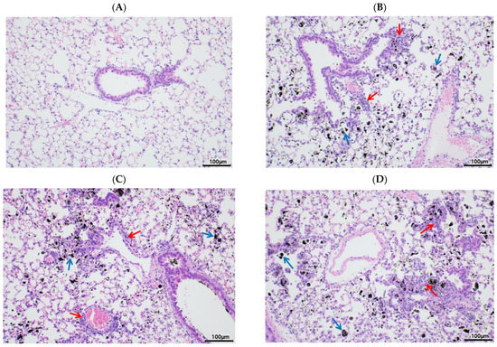 Histological changes in lung tissue after ellagic acid (EA) pretreatment and particulate matter (PM) instillation. C57BL/6 mice were orally pretreated with ellagic acid (EL; 20 mg/kg or EH; 100 mg/kg) for 7 days, and then PM (5 mg/kg) was intratracheally administrated for 7 days with or without ellagic acid pretreatment. Representative images of hematoxylin and eosin (H & E) stained sections obtained from the (A) CON, (B) PMI, (C) EL + PMI, and (D) EH + PMI groups (n = 8). Blue arrows indicate black-pigment-laden macrophages in the alveoli and alveolar lumen interstitium. Red arrows point to the infiltrated inflammatory cells in the peribronchiolar, perivascular, and interstitial regions. Scale bars = 100 μm.